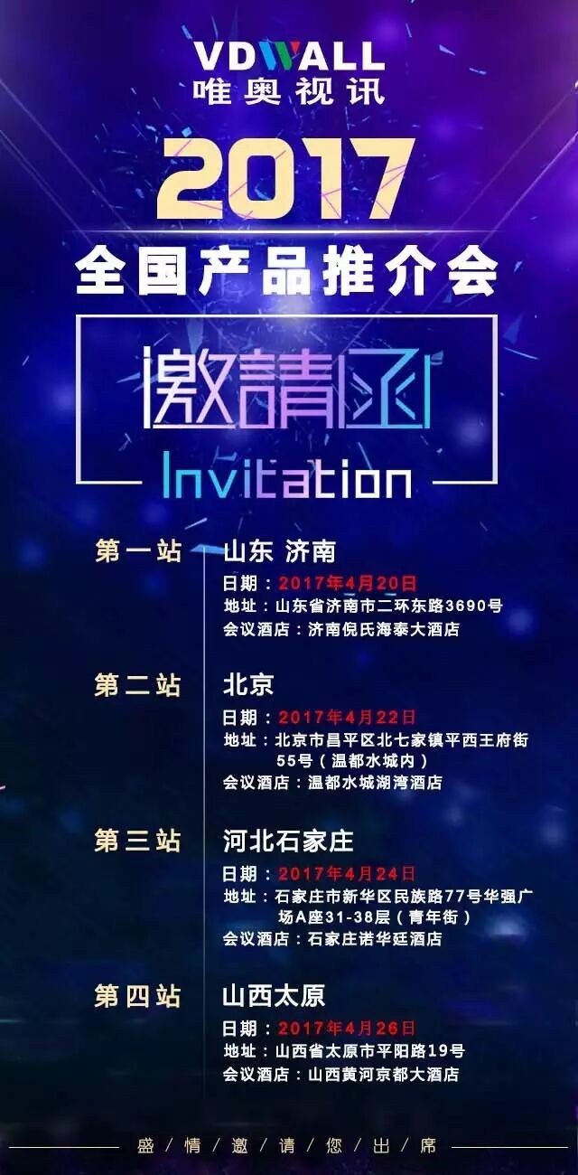 2017年4月20日唯奥视讯2017全国产品推介会将在山东济南拉开帷幕,此次推介会将联合战略合作伙伴华夏光彩一起举办,先后在山东济南、北京、河北石家庄、山西太原、河南郑州、安徽合肥、江苏南京、浙江杭州、湖北武汉、江西南昌和湖南长沙陆续开展。